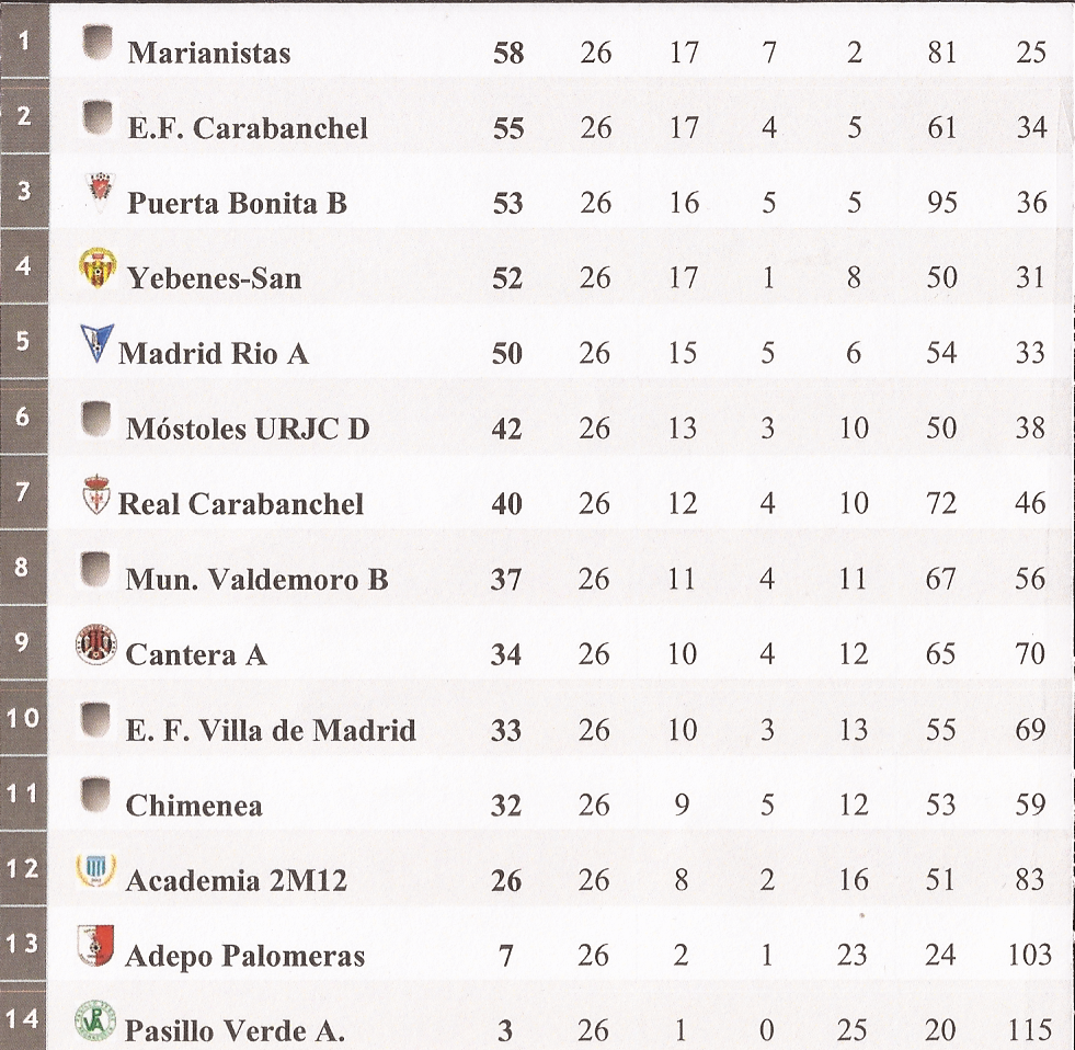 La segunda vuelta fue distinta. Incomprensiblemente se perdieron partidos contra equipos a los que en la ida se les ganó con absoluta superioridad e incluso con goleada (AFE, Nuevo Retiro, Rivas, Los Pinos). Y aún así llegamos a las últimas jornadas con posibilidades de ascender. Aquí nos pudo la responsabilidad e incluso jugando bien perdimos con la Unión (1-2) y con la ED Moratalaz (0-1) quedando al final en un 4º puesto que no hace justicia a la temporada hecha por el equipo.